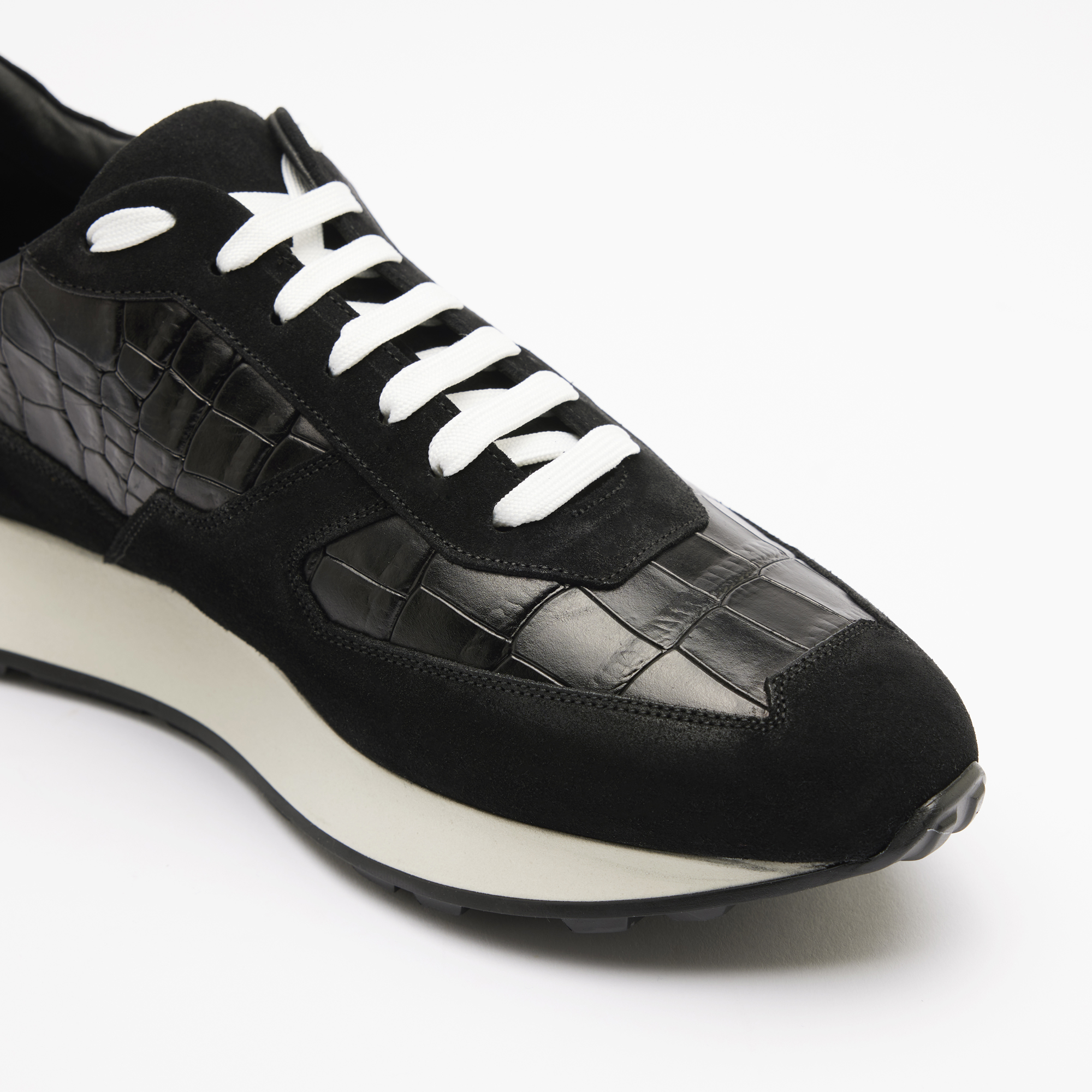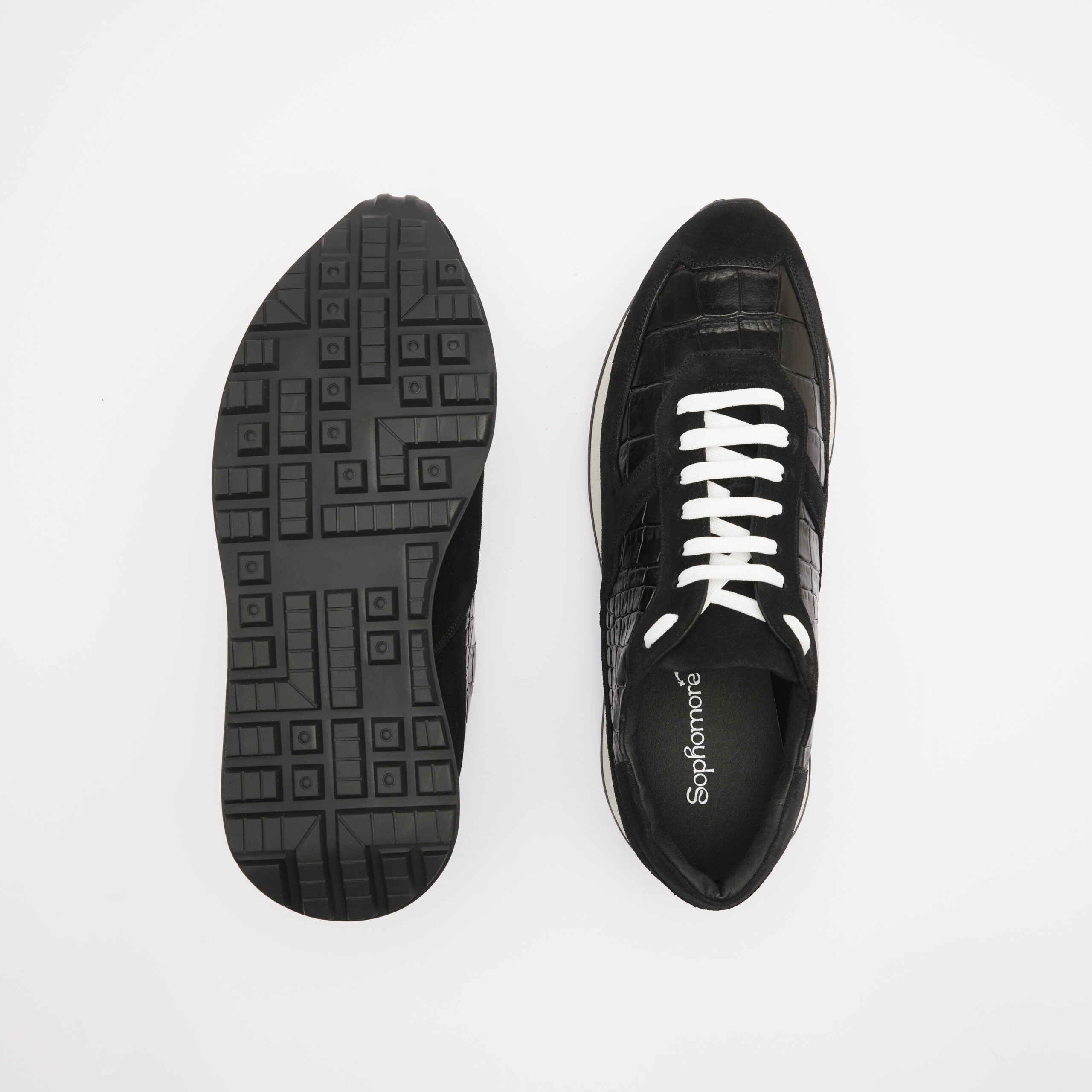 La Sneaker Sophomore revisite la silhouette running avec une élégance contemporaine. Le cuir français noir embossé effet croco se mêle au velours noir pour un subtil jeu de textures, tandis que les lacets en coton ciré blanc apportent un contraste graphique et moderne. La semelle gomme légère noire et blanche garantit souplesse et adhérence, pour un confort optimal au quotidien. Fabriquée à la main en Espagne, cette sneaker allie savoir-faire artisanal et design innovant.